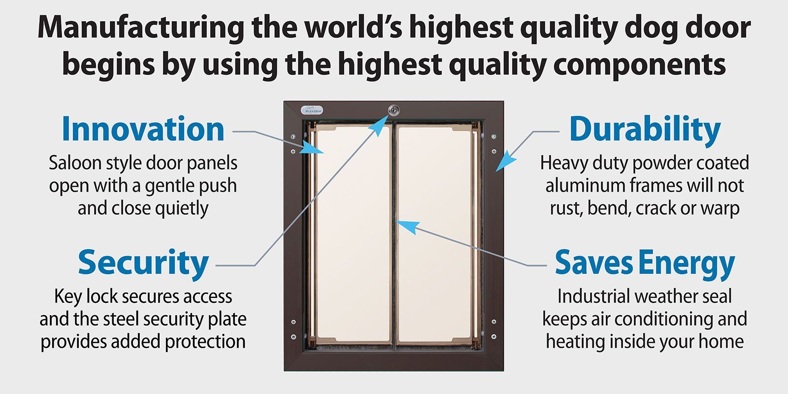 - SUSTAINABLE Made partly from recycled materials, the Guard Dog Pet Door uses a polyurethane foam insulated security panel, an insulated tri-panel pet flap, and weather seals on both to keep the air in and the elements out.